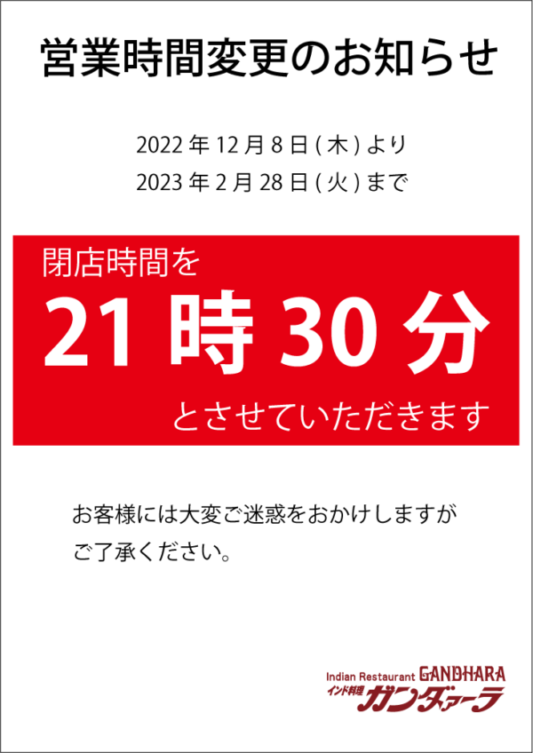 ガンダァーラ刈谷店・豊田店は、2023年2月28日(火)まで閉店時間を21時30分へ変更いたします。